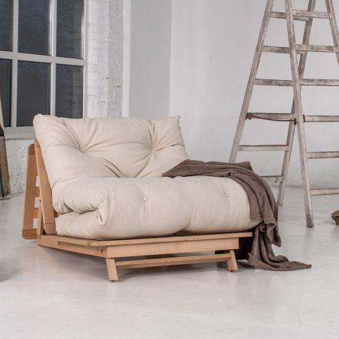 Canapé Futon Convertible en Bois Naturel & Tissu Crème